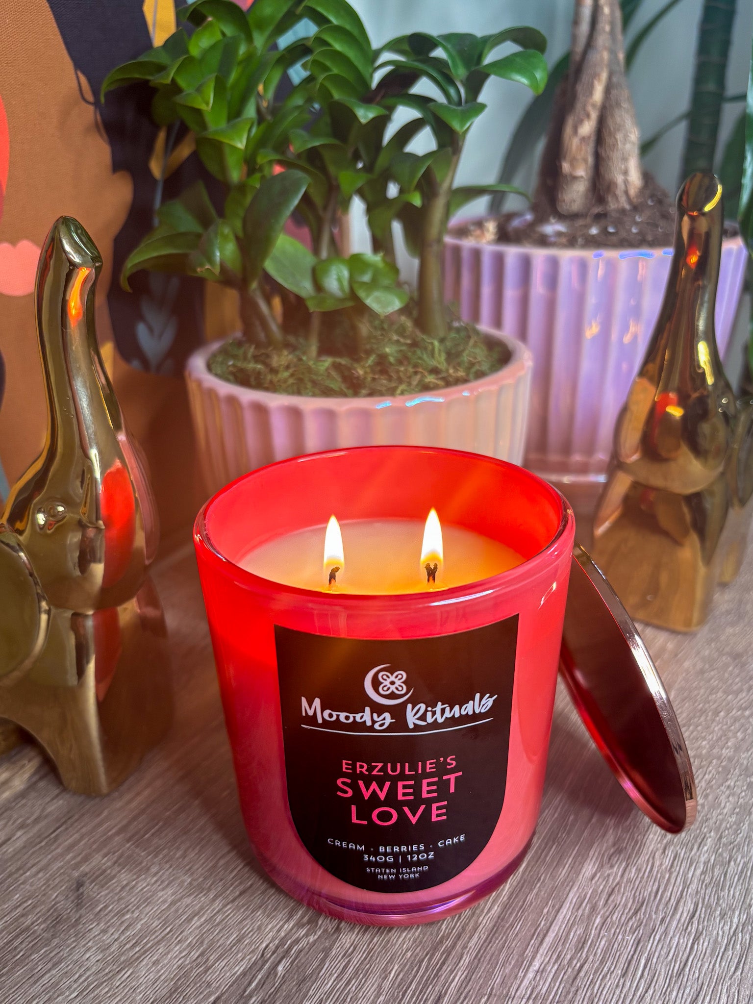 Turn up the romance with Erzulie's Sweet Love. Inspired by the lwa of beauty, love, and passion, this candle fills your space with the irresistible scent of luscious strawberry cake. Poured by hand into a shimmering pink iridescent vessel, it’s more than a candle—it’s a little love spell for your room. Light it, and let the sweet, seductive energy flow.